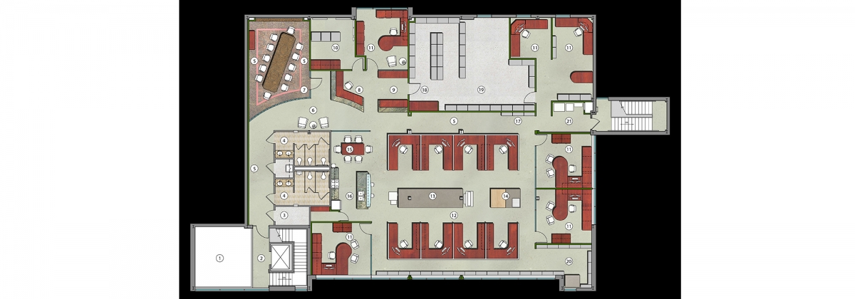SGB discovered the chance to acquire a building primarily occupied by a Fortune 500 bank which desired to stay on a long-term lease. Seizing the opportunity to create an asset base, the partners claimed the top floor, renovating the existing maze of small offices and hallways to be an open and collaborative workspace flooded with natural light. The finished space showcases polished concrete floors, interior storefront, granite counters, and a modern wood paneled gallery wall.